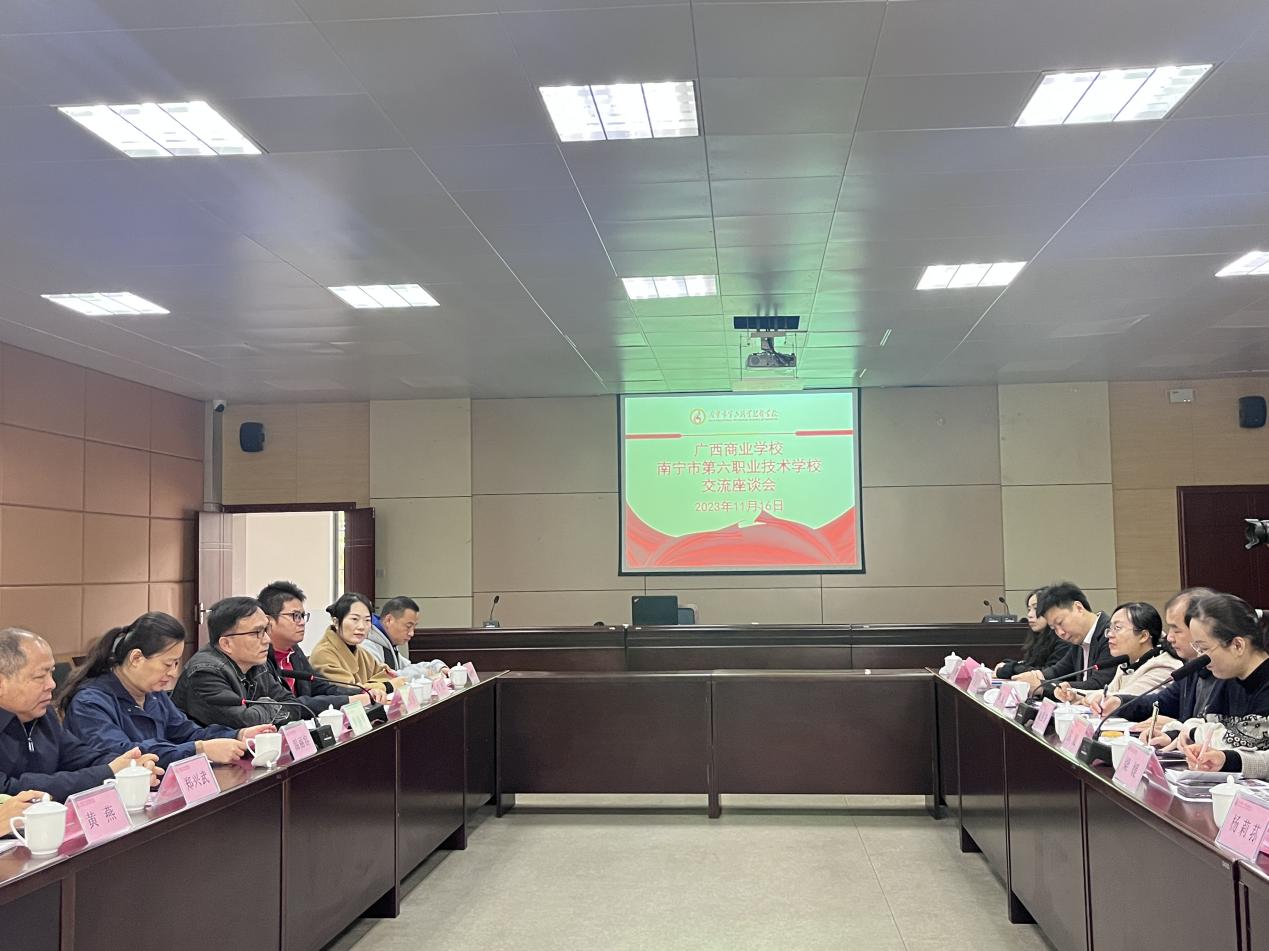 在两校举行的座谈会上,南宁市第六职业技术学校校长温丽容介绍该校的办学情况,副校长罗集学分享开展升学备考准备工作的有效途径,两校教师进行交流探讨。