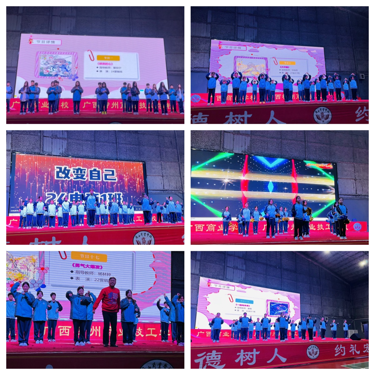 此次比赛的评委阵容强大,由团委书记、学工处主任谢冰梅,招生处主任骆芬萍,团委副书记覃丽秋,公共基础部副主任王璇,以及现代服务系副主任潘亮宇担任。他们秉持着公正、公平、公开的原则,从专业的角度对每一个参赛班级的表现进行了细致的评判。